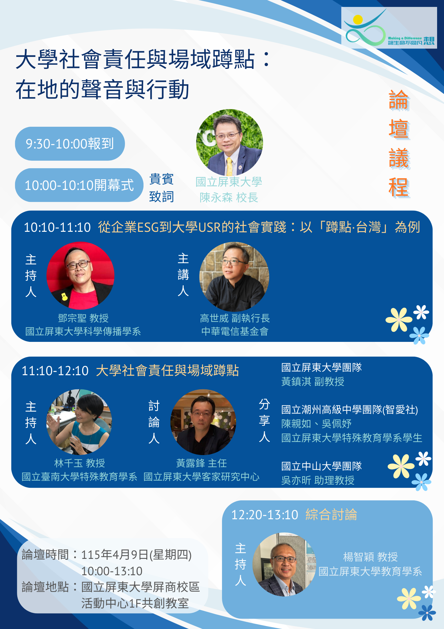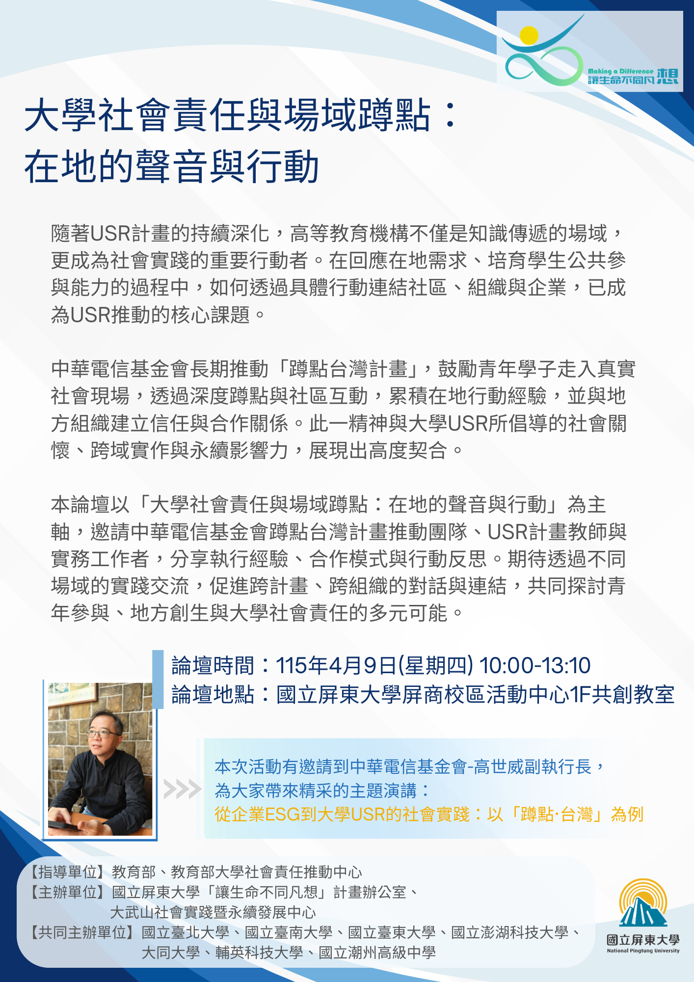 本論壇以「大學社會責任與場域蹲點:在地的聲音與行動」為主軸,邀請中華電信基金會蹲點台灣計畫推動團隊、USR計畫教師與實務工作者,分享實際執行經驗、合作模式與行動反思。