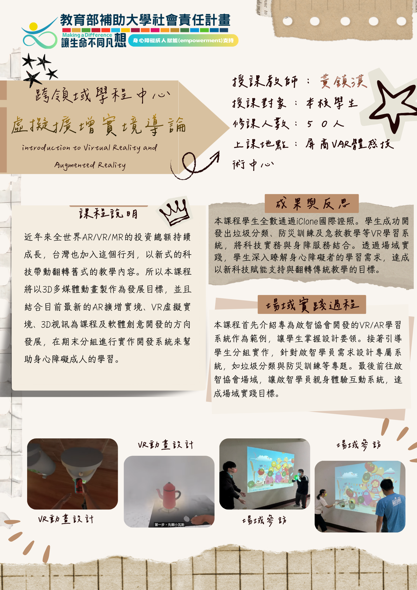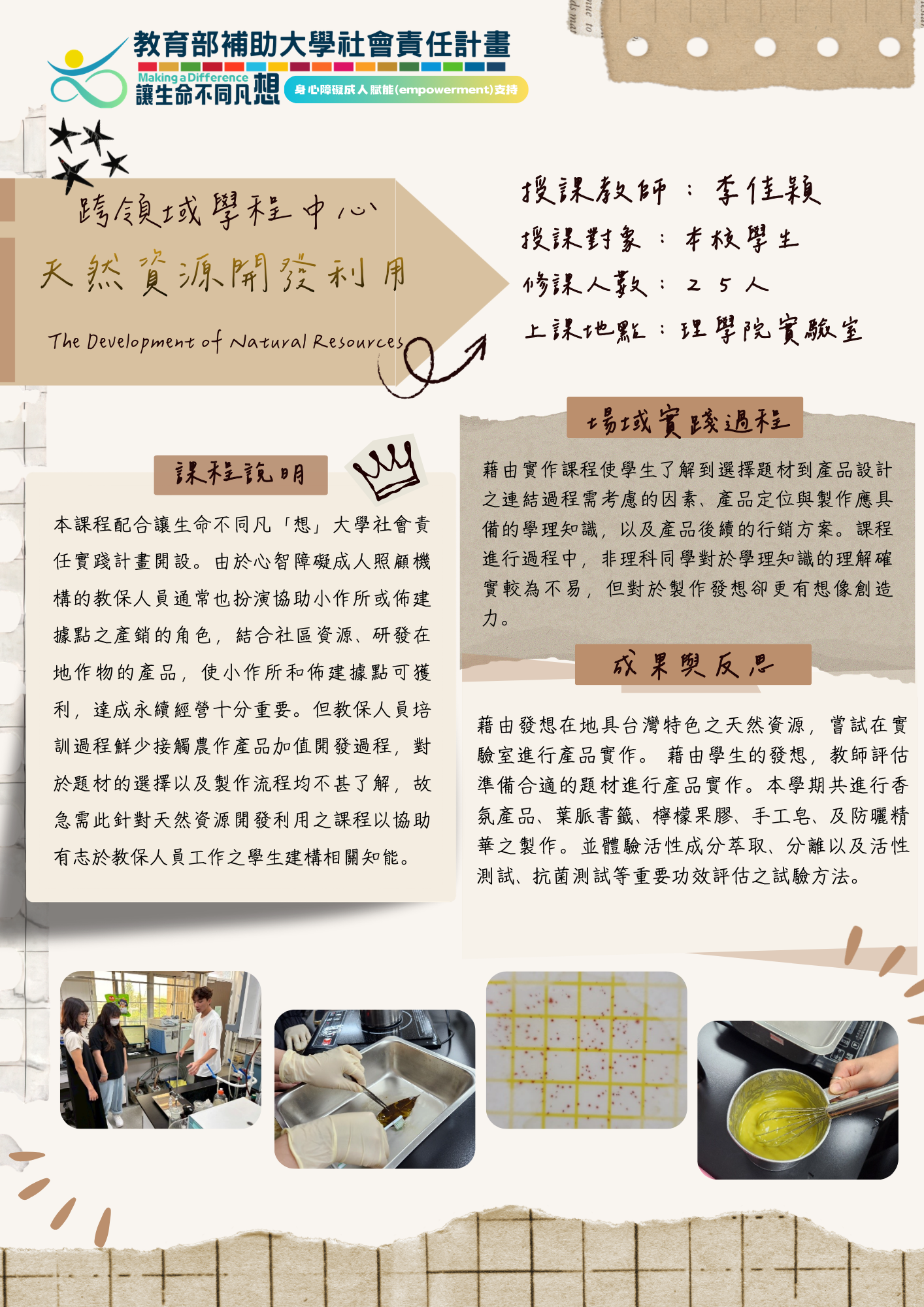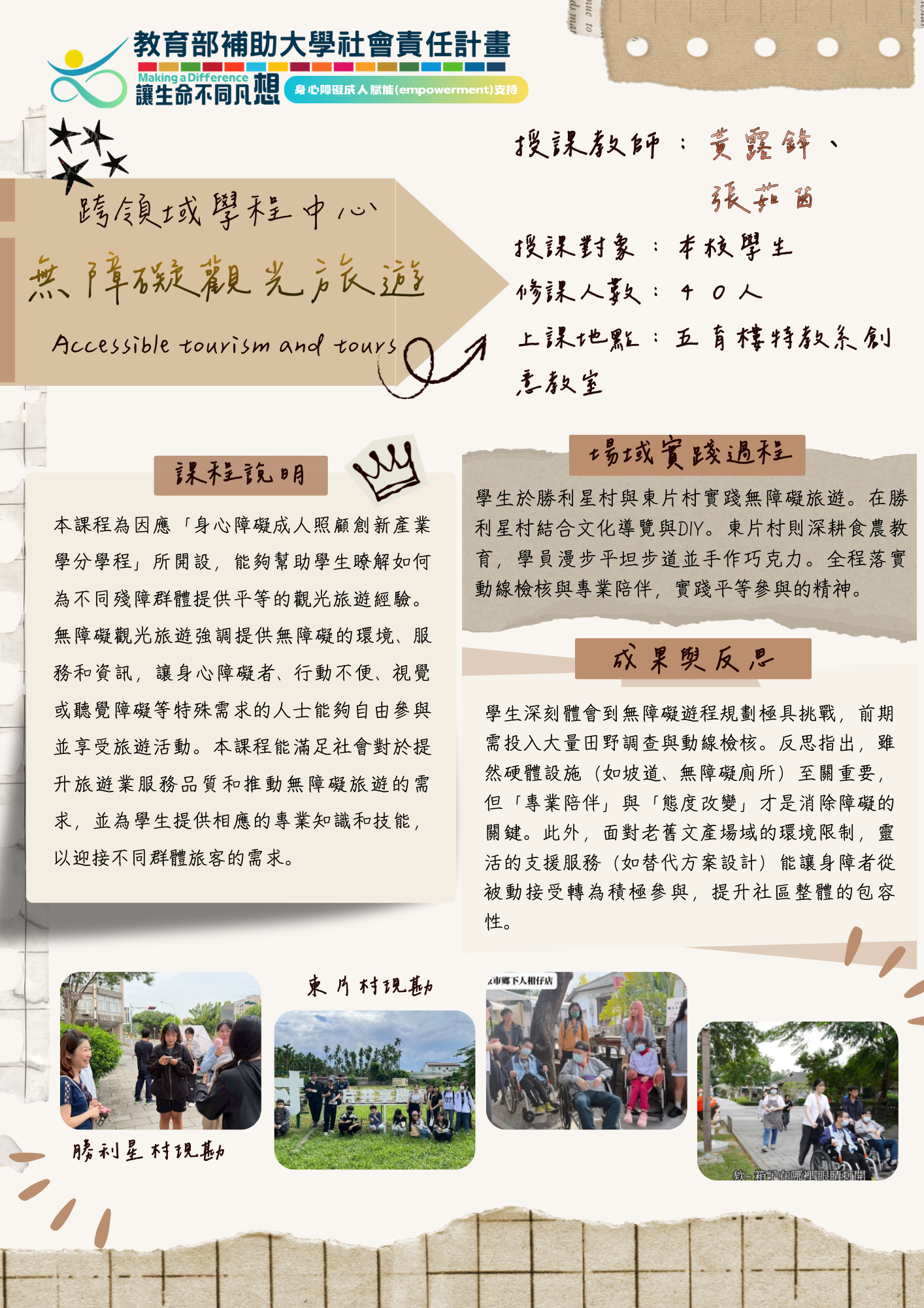 3. 豐富場域實踐機會:師生的研發提供給身心障礙成人照顧機構豐富的課程,含健康維護、科技融入課程設計、機構人員培力、研發產品與行銷等多元支持,並提供至場域實踐機會,修習學分學程也能獲寶貴實作經驗。